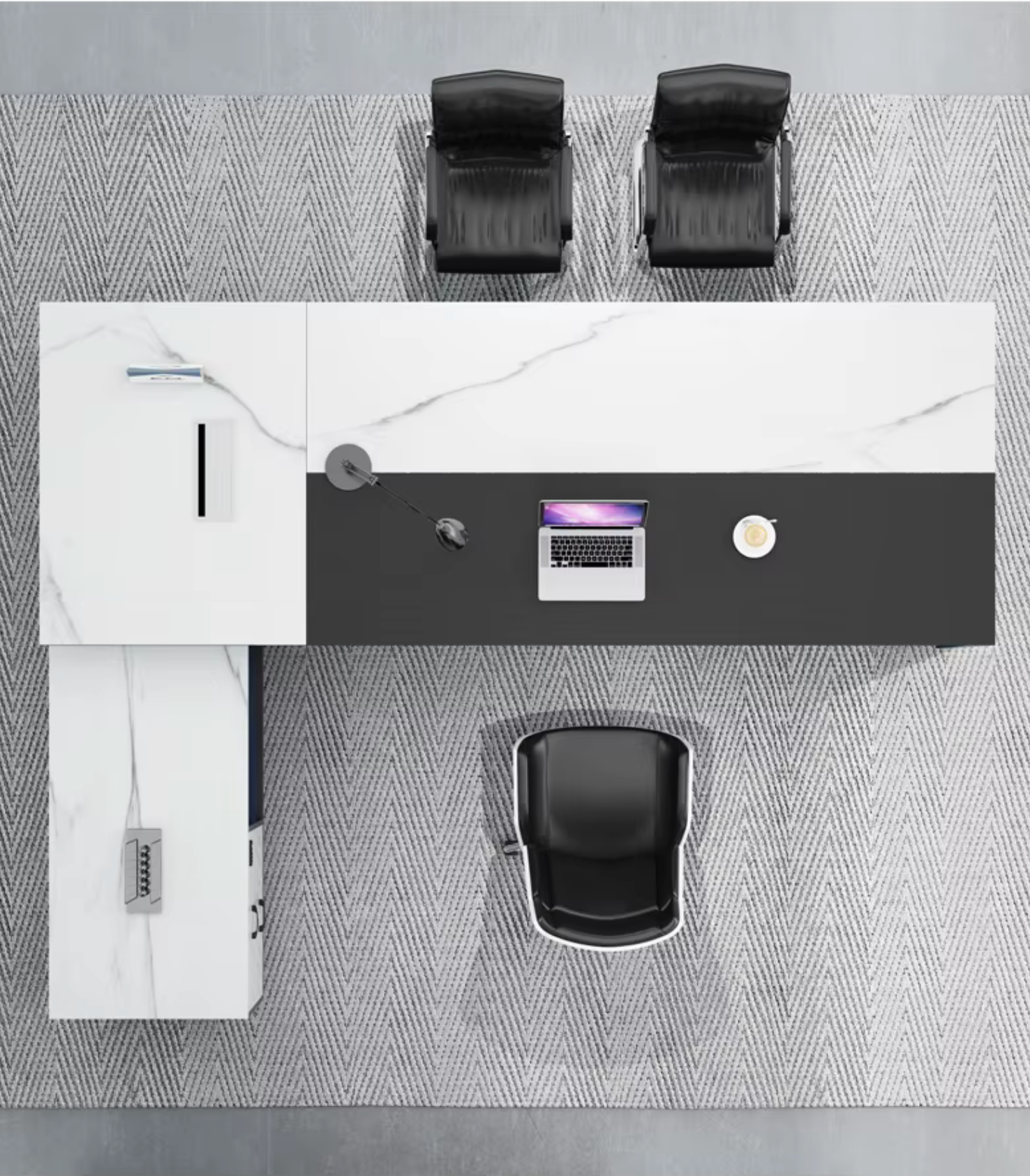 The Onyx Marquina L-Shaped Executive Desk blends a sleek monochrome palette with marble-inspired surfaces, giving your office a refined, modern edge without trying too hard. Its extended L-shape delivers a wide, uninterrupted workspace that makes multitasking feel controlled instead of chaotic. You get the visual presence of a premium executive setup with the practical layout needed for real daily use.