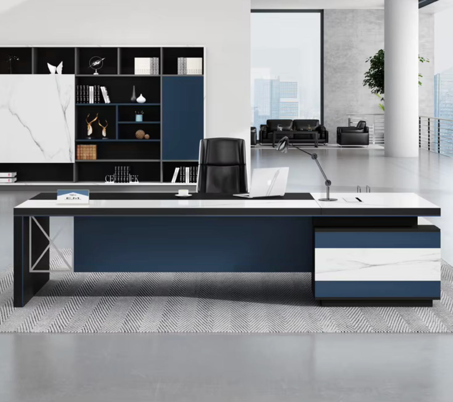 Function is built straight into the structure: a secure code-lock cabinet, smooth drawers, a dedicated computer host area, and open shelving that keeps essentials close without littering your desktop. Durable materials, sharp geometry, and clean lines give the desk long-term stability and a professional aesthetic that speaks for itself. This is the kind of workstation that elevates the room before you even sit down.