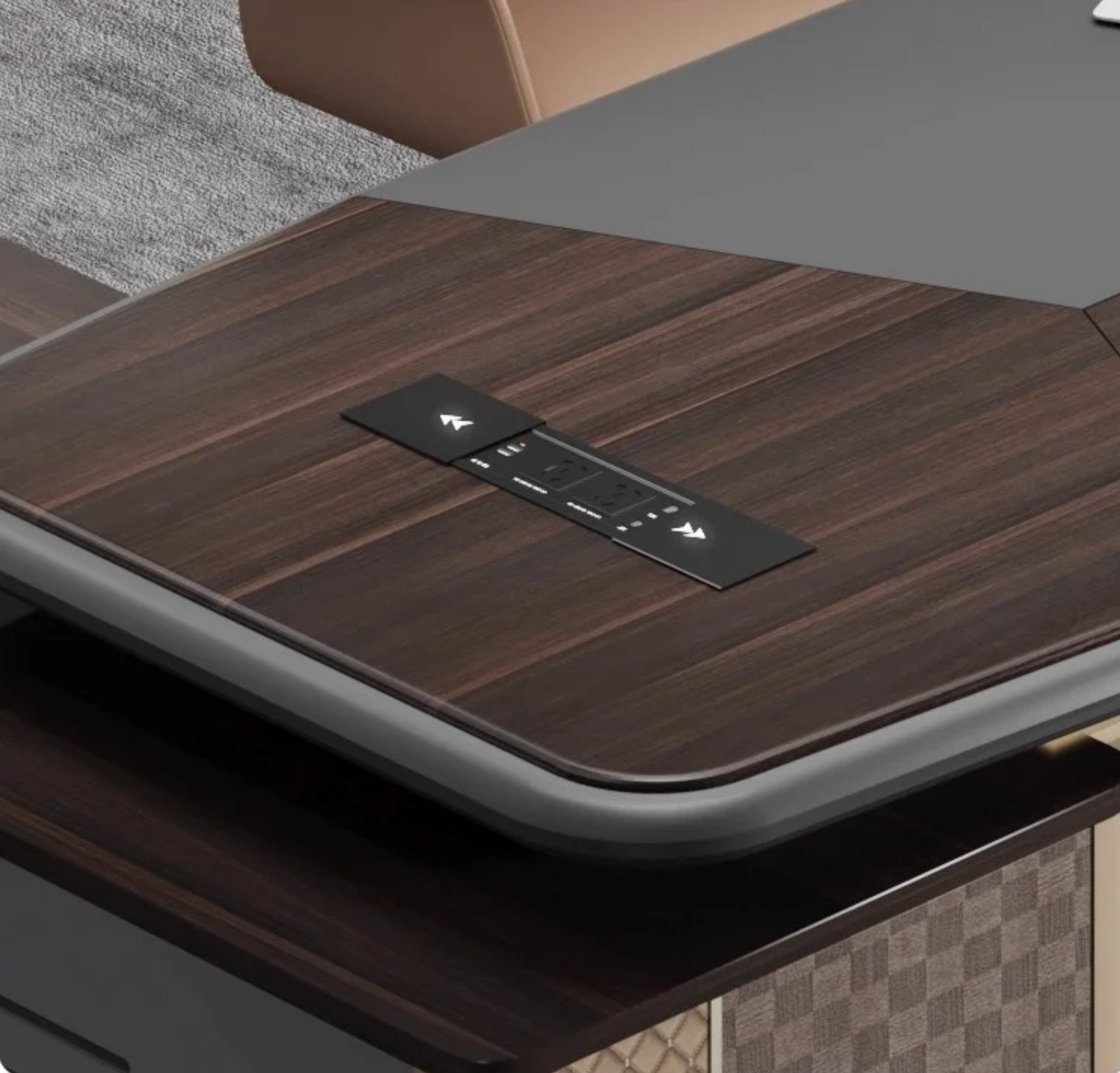 The Vantura L-Shaped Executive Desk blends sculpted curves with rich wood textures, giving the space a refined, modern presence. Its two-tone finish, rounded edges, and premium detailing create a commanding centerpiece that elevates any executive office. The integrated power module keeps your workspace streamlined, offering discreet access to essential ports without interrupting the desk’s sleek design.